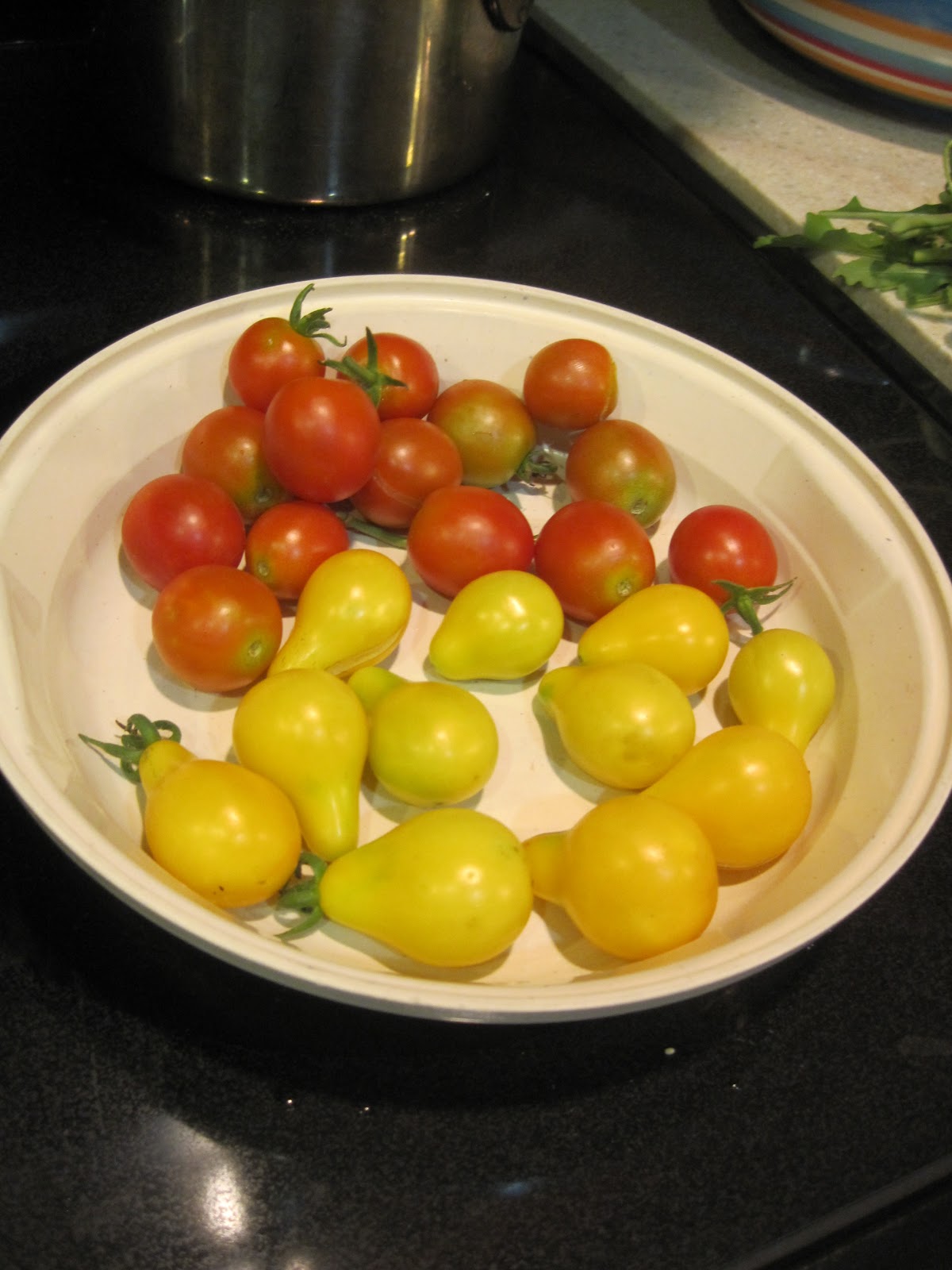 These beautiful yellow pear tomatoes are as tasty as they are attractive. The Farmer's Daughter is working at an organic farm this summer and has brought home some Black Cherry (Really very Dark Purple) tomatoes that are wonderful as well. These heirloom varieties are getting very popular and people are becoming to appreciate what a tomato tastes like and that they can have lots of different appearances.